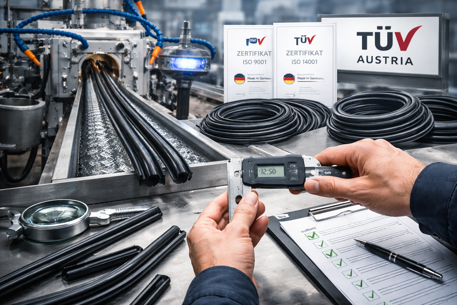 ISO 9001 und ISO 14001 zertifiziert. Reproduzierbare Prozesse, gleichbleibende Qualität und nachhaltige Produktion am Standort Deutschland.